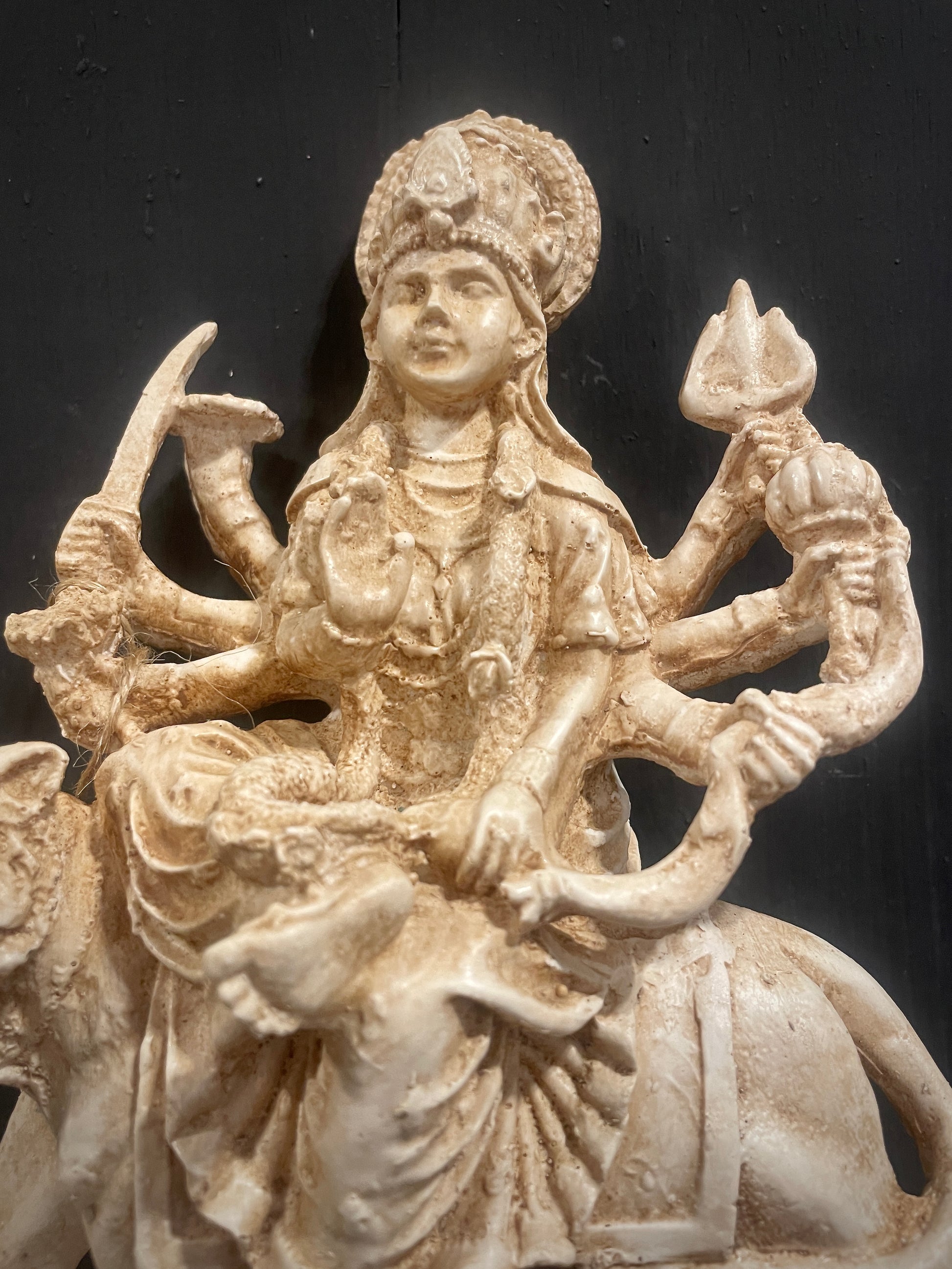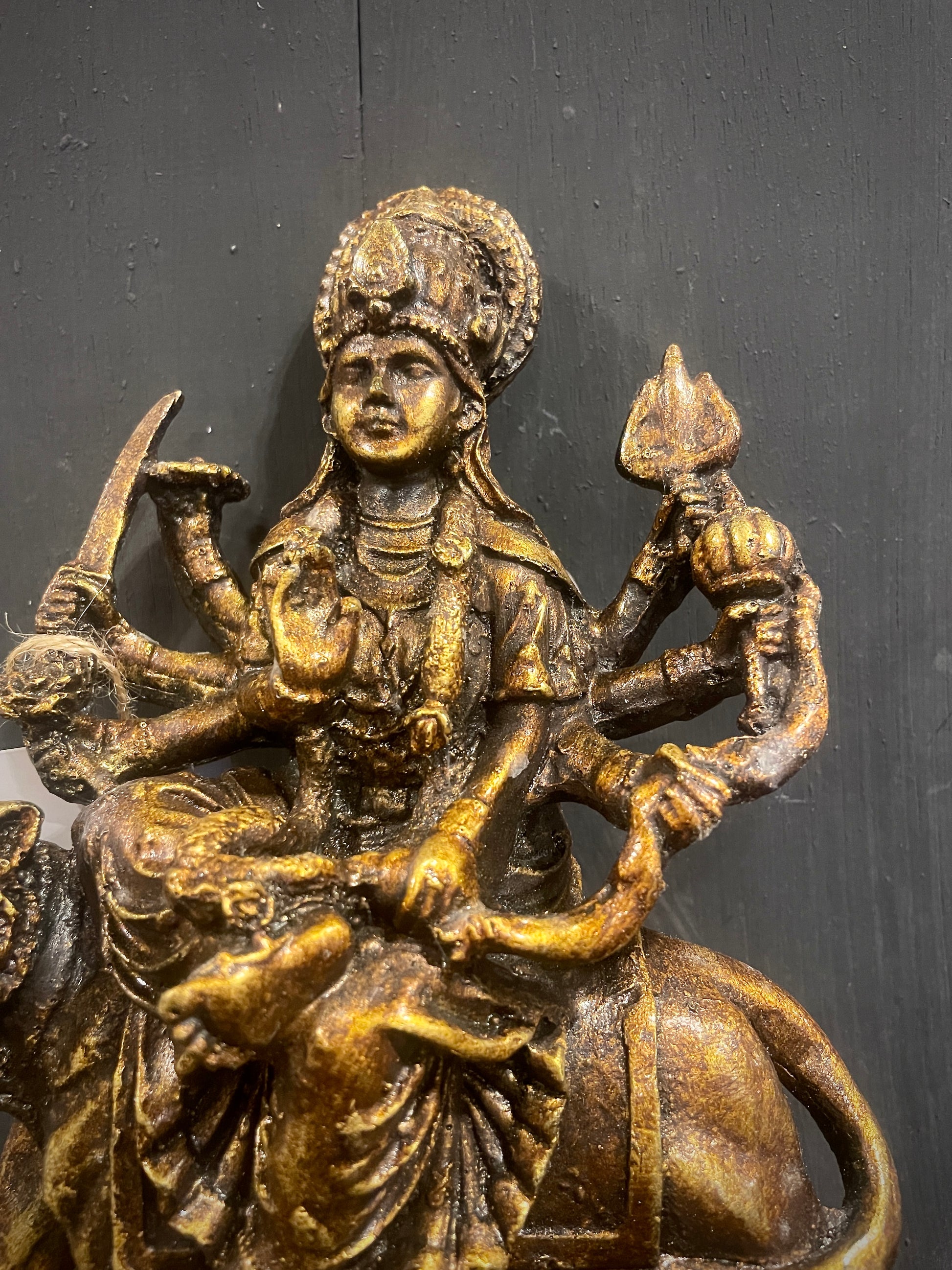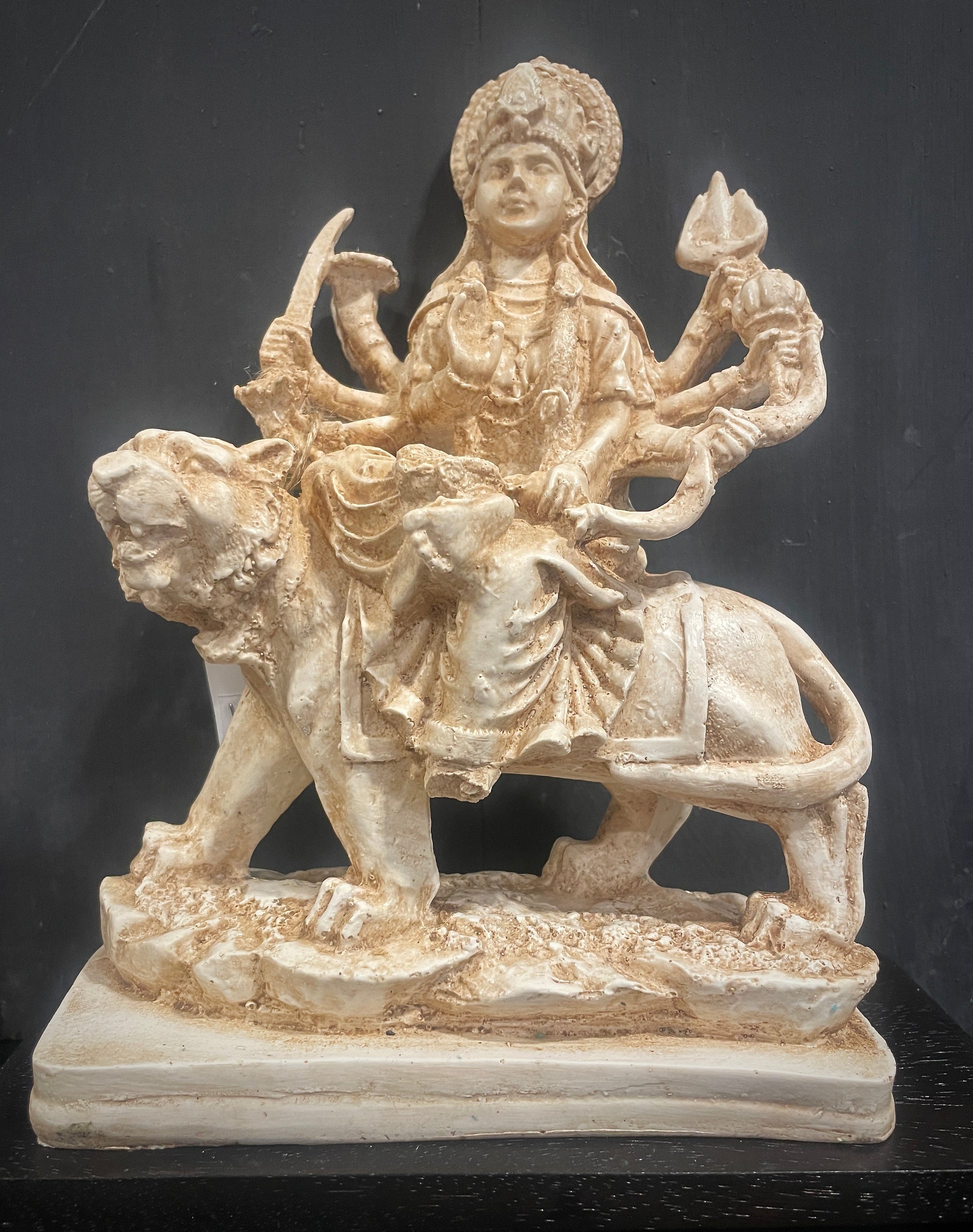 De naam Durga betekent in het Sanskriet 'een fort', wat staat voor een moeilijk in te nemen plaats. Dit vertegenwoordigt haar aard als een onoverwinnelijke, onpasseerbare en onmogelijk te verslaan godin. In de meeste van haar afbeeldingen rijdt Durga op een leeuw of een tijger richting strijd. Ze heeft acht tot achttien handen, die elk een ander wapen dragen. Sommige afbeeldingen tonen Durga als een drie-ogige godin, in overeenstemming met haar gemaal Shiva. Elk van de ogen vertegenwoordigt een ander domein.Onder de voorwerpen die Durga draagt, wordt ze meestal afgebeeld met zwaarden, een boog en pijlen, een drietand, een discus, een schelp en een bliksemschicht. Elk van deze wapens is een deel van Durga's symbologie. Deze wapens zijn essentieel voor haar strijd tegen demonen en haar rol als beschermster van de wereld.