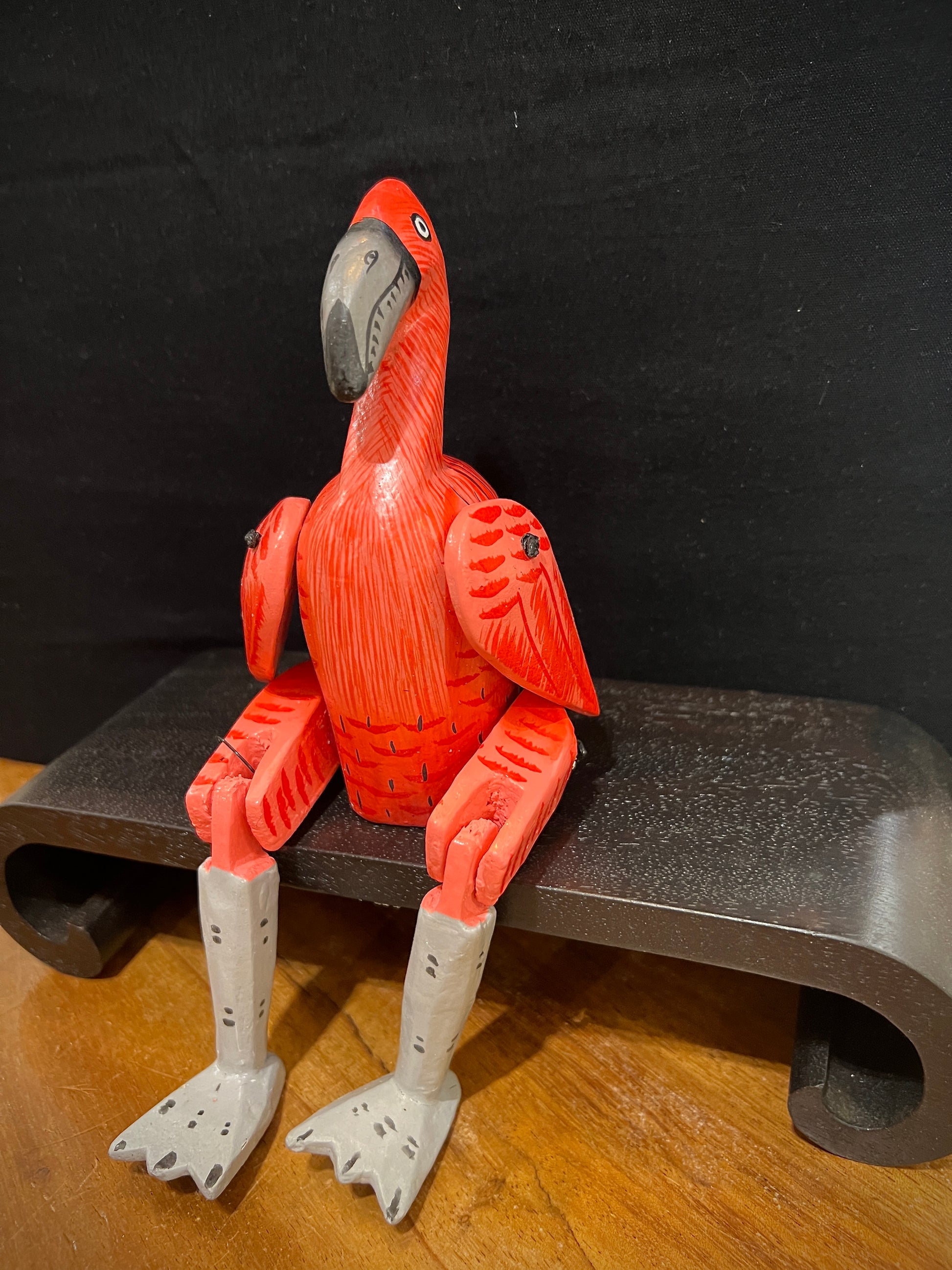 Zittende houten flamingo met de hand beschilderd.
