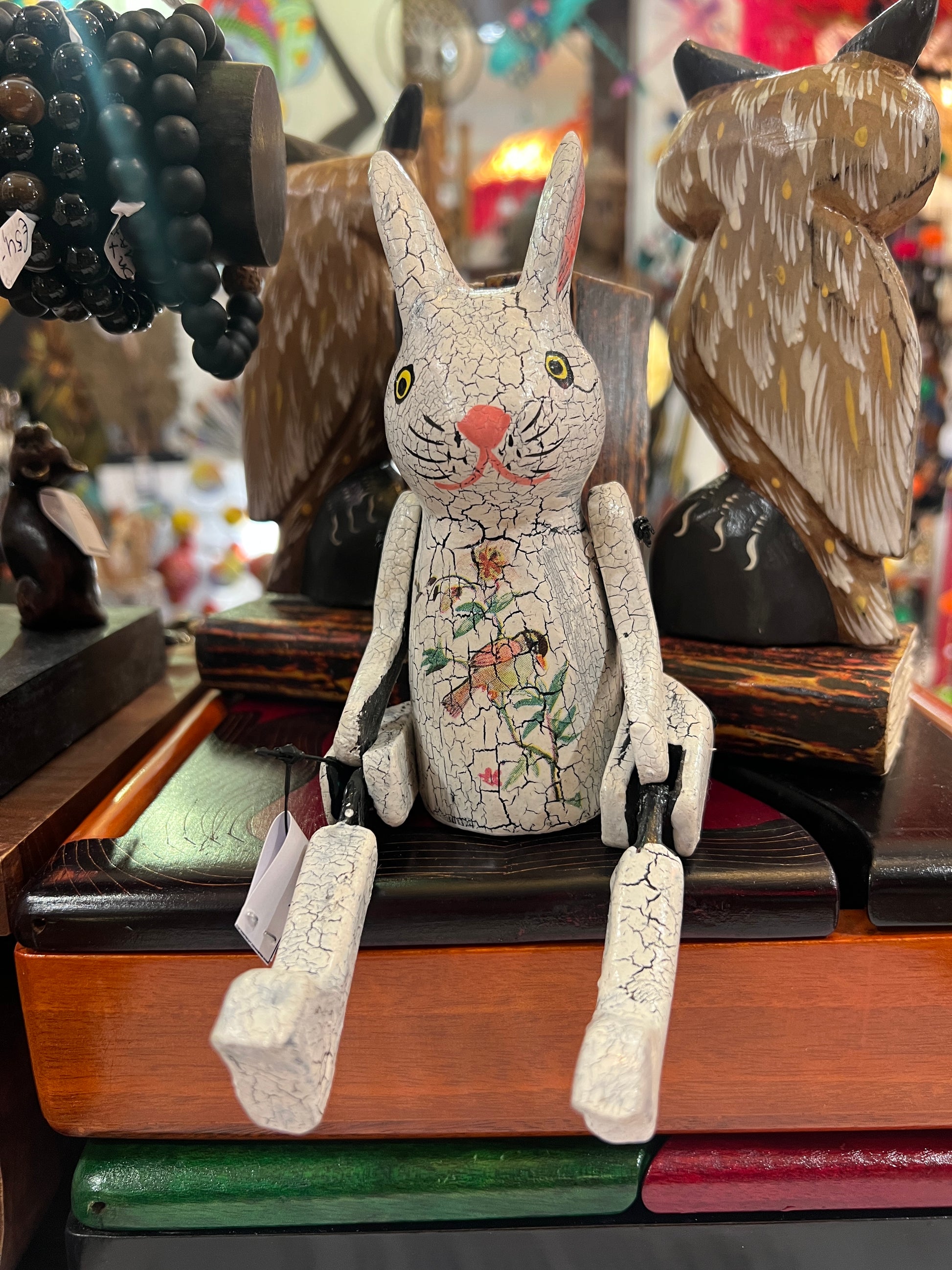 Zittende houten konijn met de hand beschilderd, op haar borst is een vogeltje geschilderd op een tak.