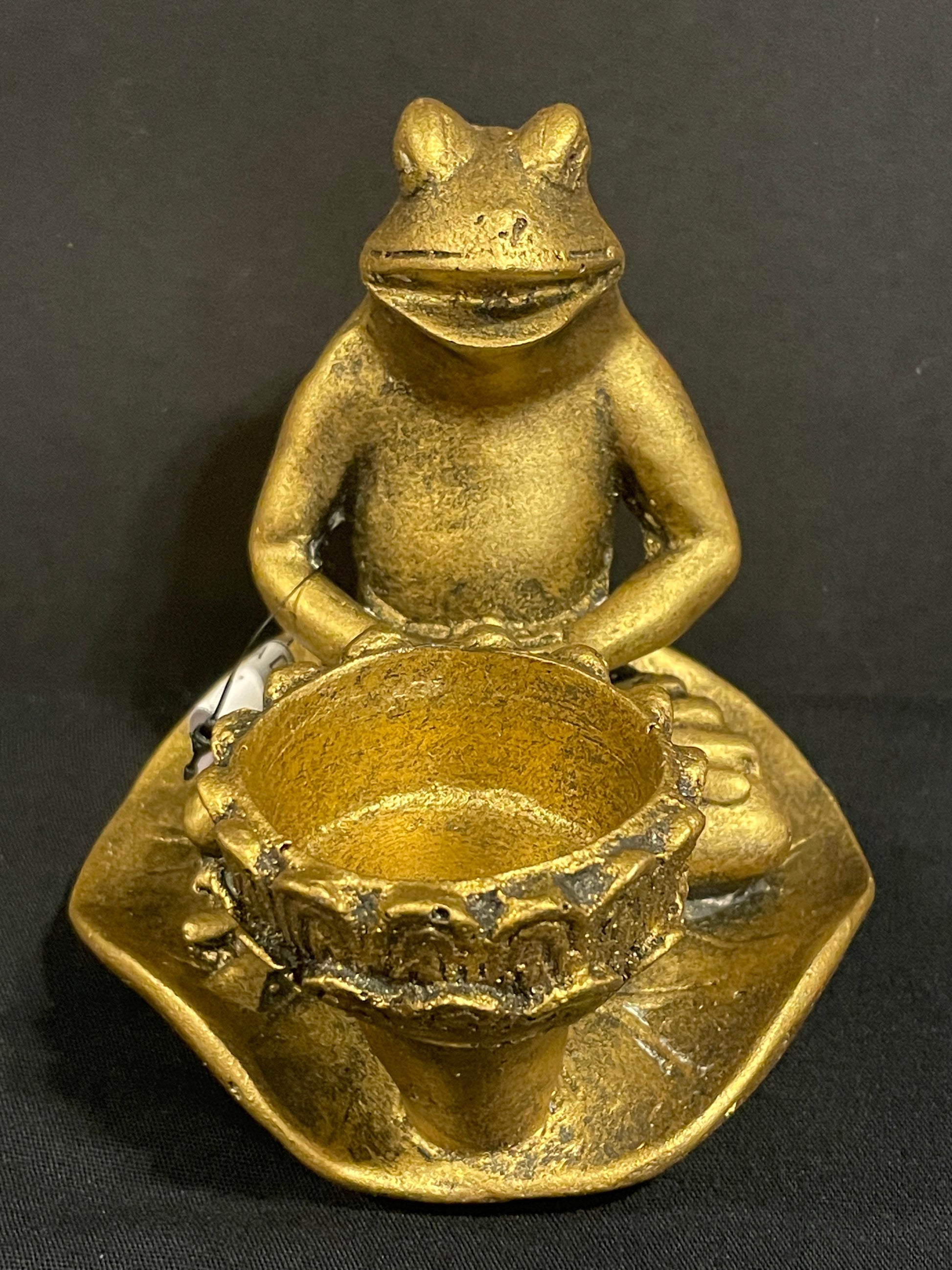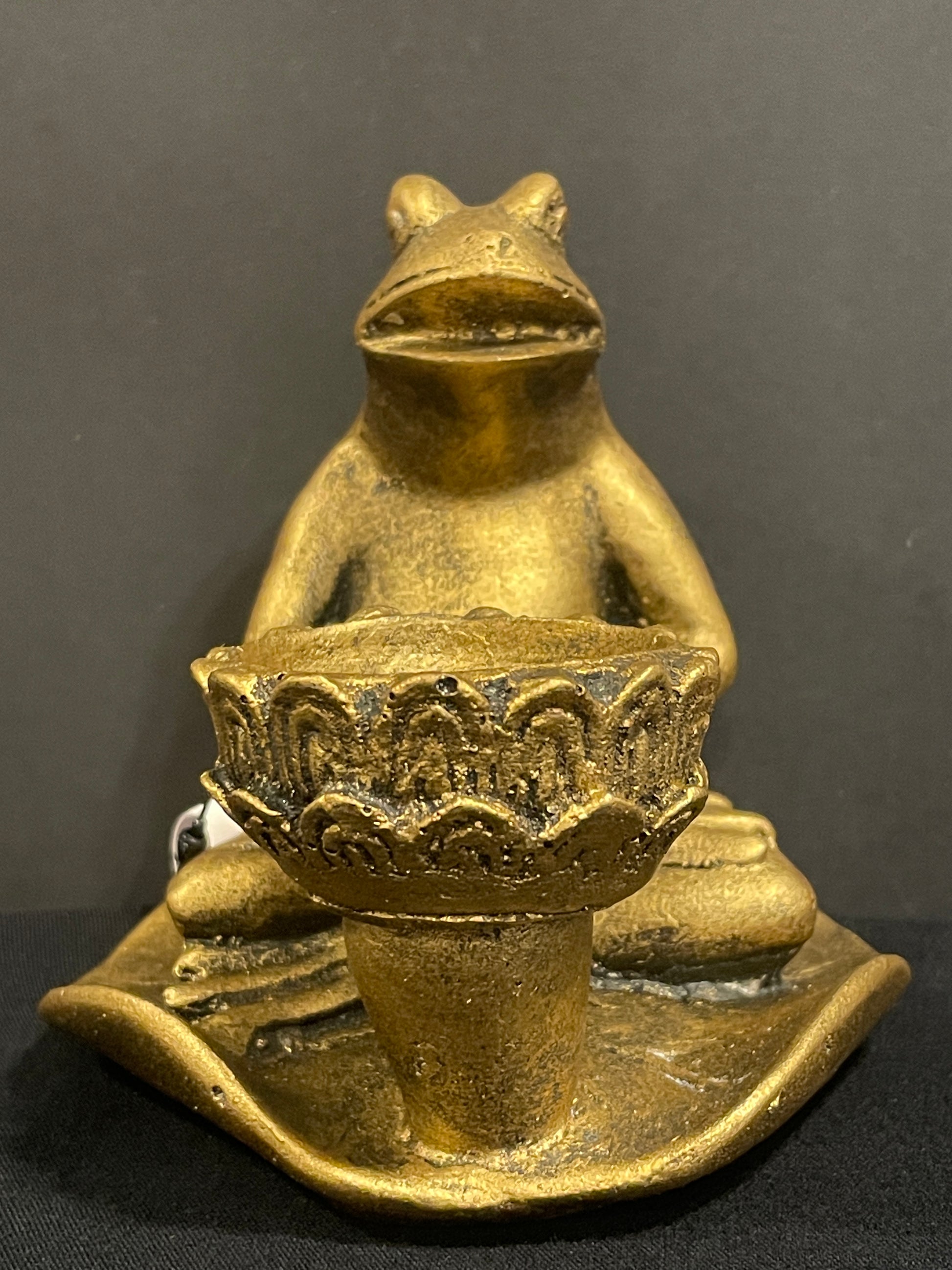 De kikker zit op een lotusblad te mediteren voor een lotusbloem.