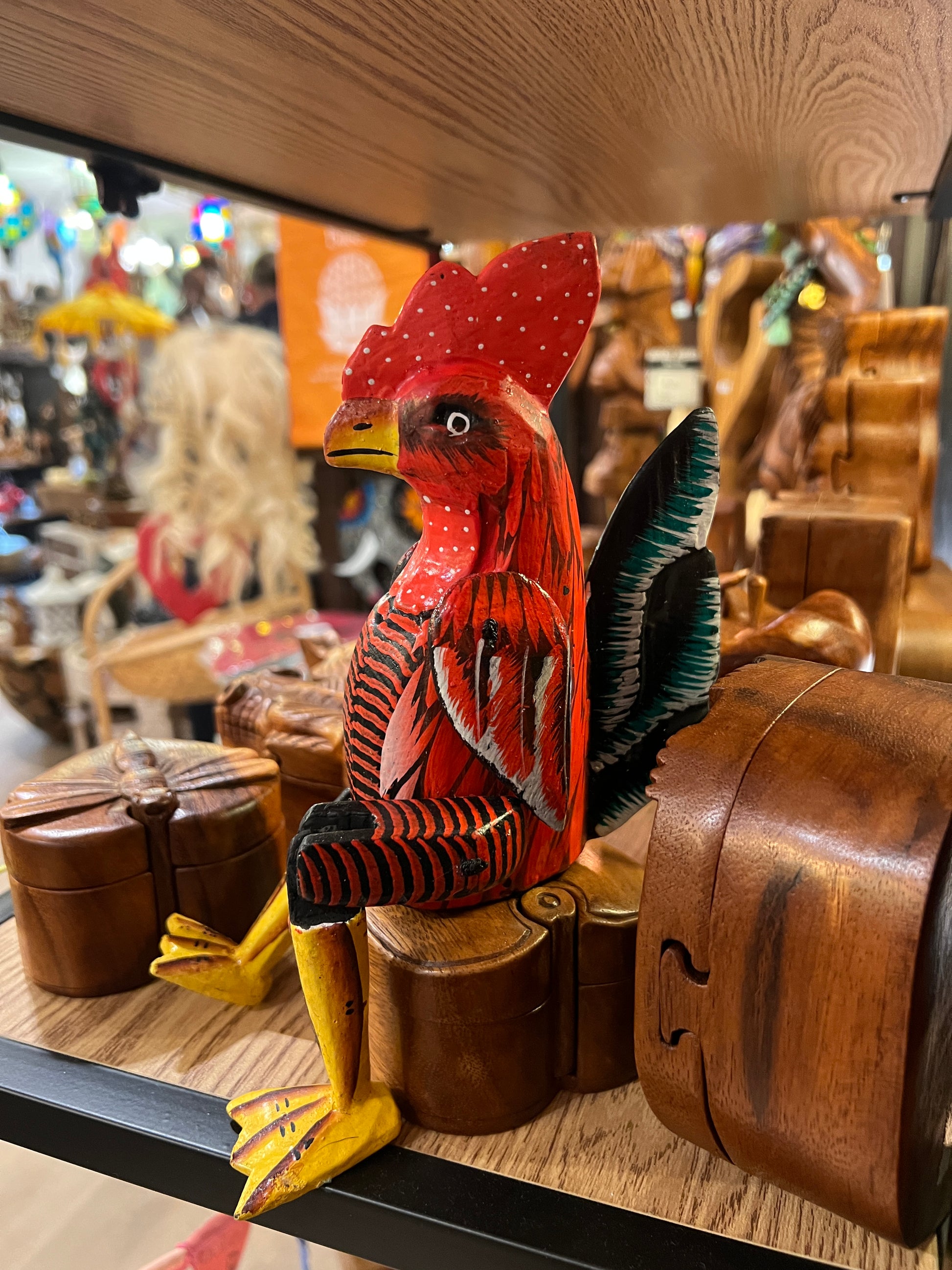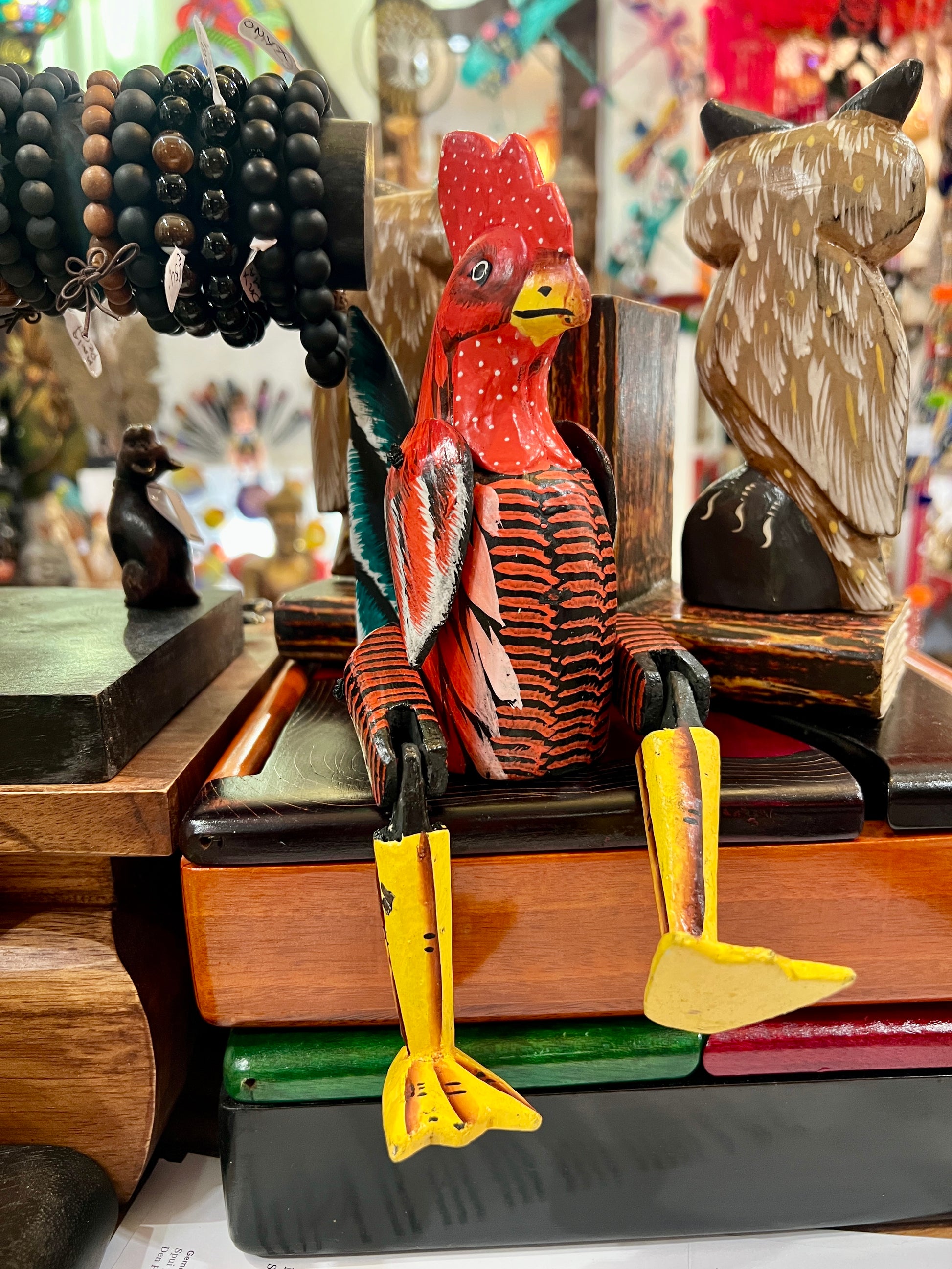 Zittende houten kip met de hand beschilderd.