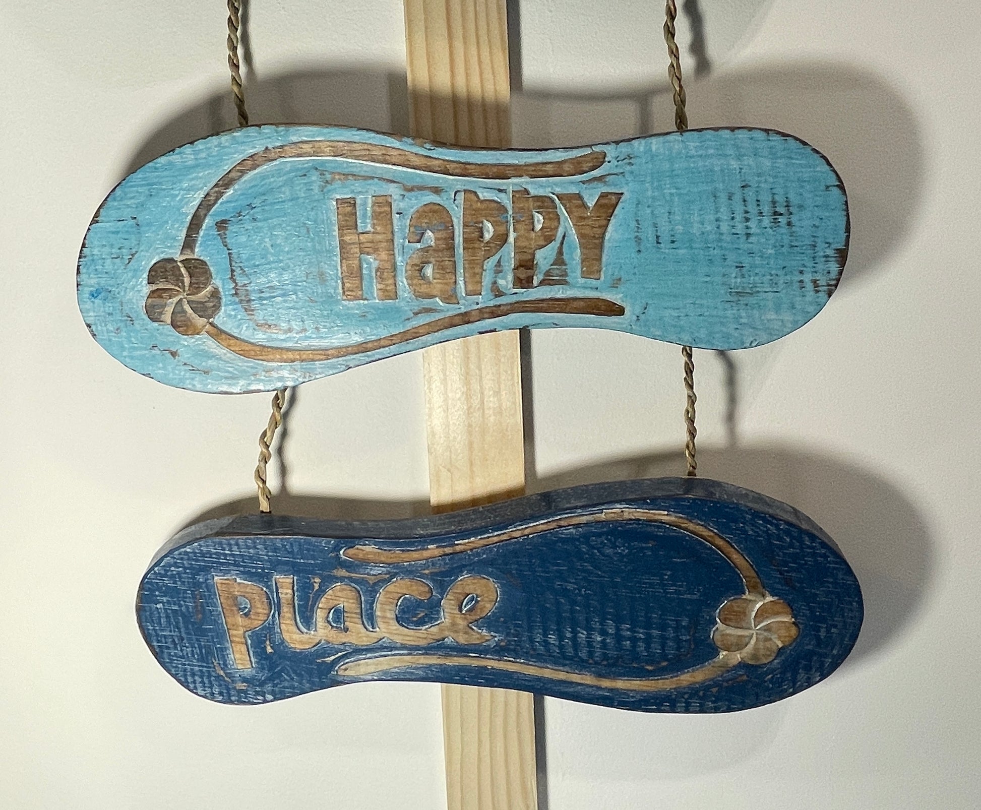 Houten blue-washed (sandalen) tekstbordjes om op te hangen.