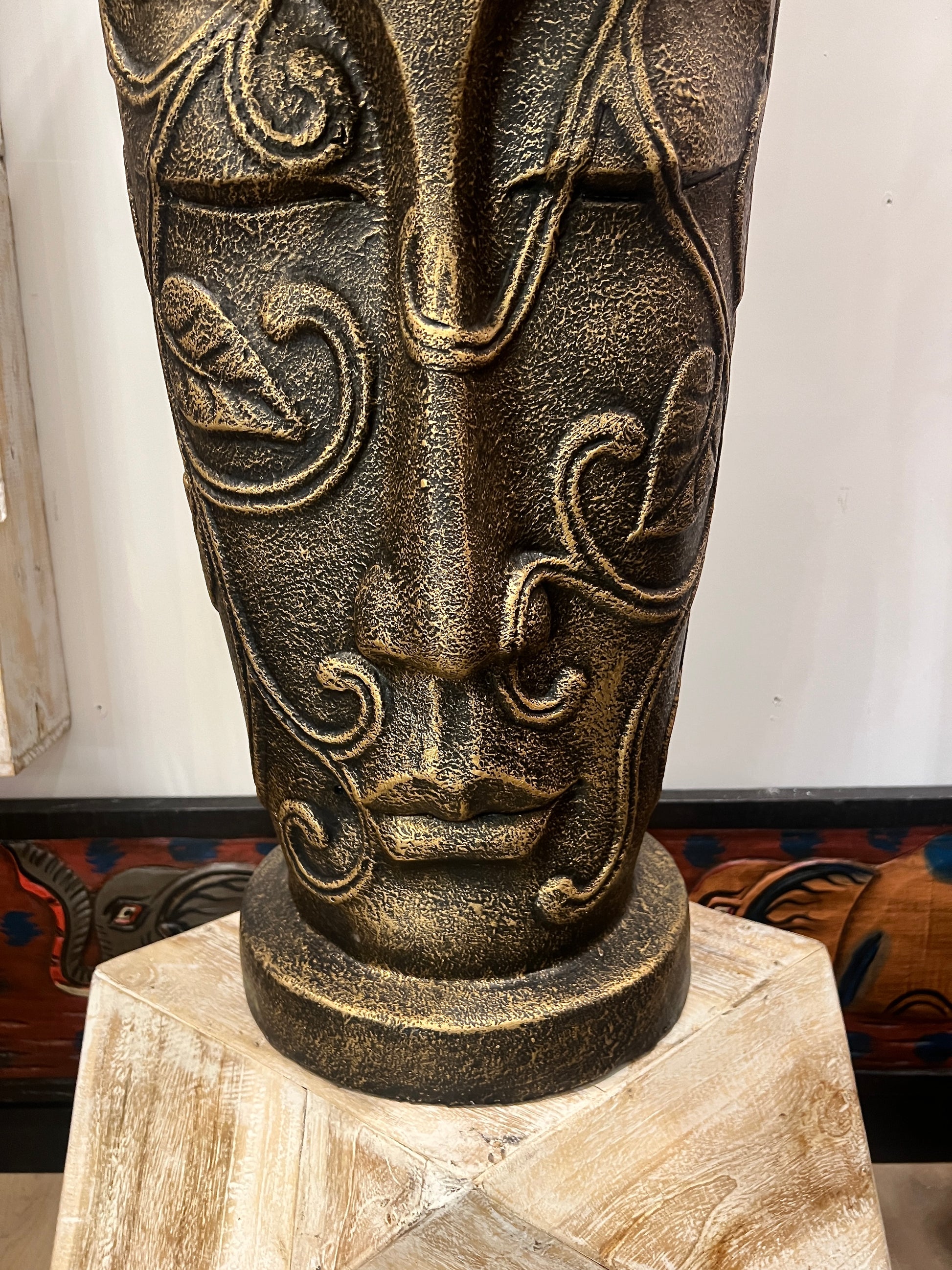 Hun minimalistische stijl had betrekking op vormen die overal in Polynesië voorkomen. Moais zijn uitgehouwen in relatief platte vlakken, de gezichten dragen trotse maar raadselachtige uitdrukkingen. Deze vaas is geïnspireerd op de Moai.